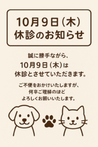 【10月9日(木)休診のお知らせ】 2025.10.8 Post 【10月9日(木)休診のお知らせ】都合により、10月9日(木)は休診とさせていただきます。ご迷惑をおかけしますが、よろしくお願いいたします。